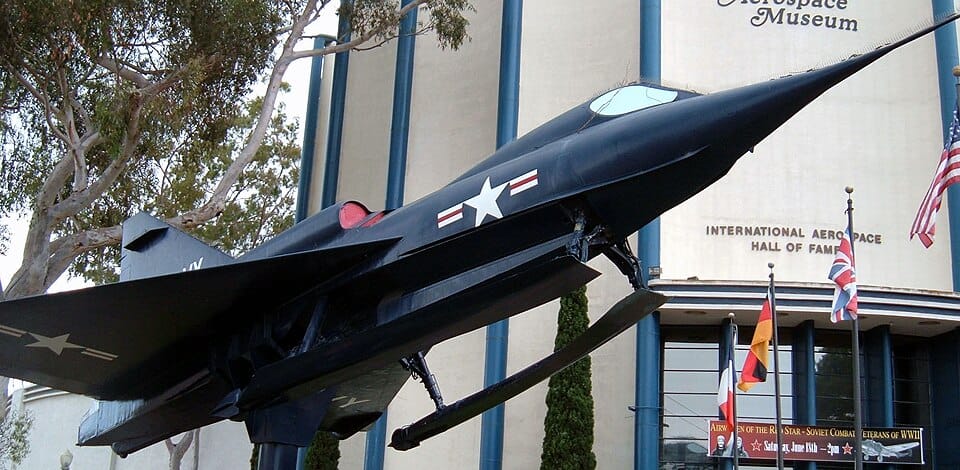 The XF2Y-1 Sea Dart in flight over San Diego Bay — a delta-winged jet fighter that launched from and landed on open water using retractable hydro-skis. US Navy / Wikimedia Commons