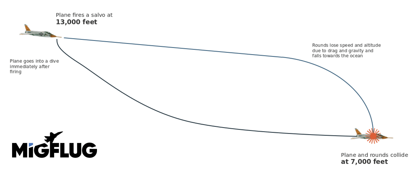 As the 20mm rounds streaked ahead of the Tiger, air resistance immediately began slowing them. A bullet has no engine. Once it leaves the barrel, drag is the only force acting on it — and at altitude, drag wins quickly. The rounds decelerated from roughly 2,300 mph to around 400 mph within seconds, and their trajectory curved downward in a ballistic arc. Meanwhile, Attridge was doing the opposite. In a steep dive with afterburner blazing, the Tiger accelerated through Mach 1 — roughly 880 mph at that altitude. The aircraft was getting faster while its bullets were getting slower.
